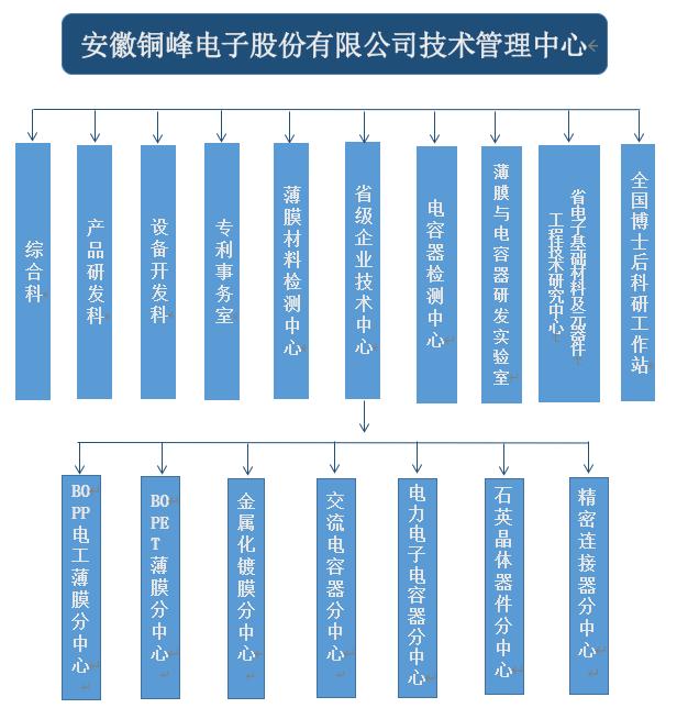 銅峰公司為國家高新技術(shù)企業(yè)、國家火炬計(jì)劃重點(diǎn)高新技術(shù)企業(yè)、國家火炬計(jì)劃銅陵電子材料產(chǎn)業(yè)基地重點(diǎn)骨干企業(yè)。公司建有完整的科研創(chuàng)新組織體系,設(shè)立技術(shù)管理中心作為技術(shù)研發(fā)的總管理機(jī)構(gòu),組織協(xié)調(diào)公司的各分子公司和相關(guān)部門,以確保公司技術(shù)創(chuàng)新精確高效地運(yùn)行。技術(shù)管理中心下設(shè)綜合科、產(chǎn)品研發(fā)科、設(shè)備開發(fā)科、專利事務(wù)室、薄膜材料檢測中心、電容器檢測中心以及薄膜與電容器研發(fā)實(shí)驗(yàn)室,同時(shí)下設(shè)省級企業(yè)技術(shù)中心、安徽省電子基礎(chǔ)材料及元器件工程技術(shù)研究中心以及國家級博士后科研工作站。